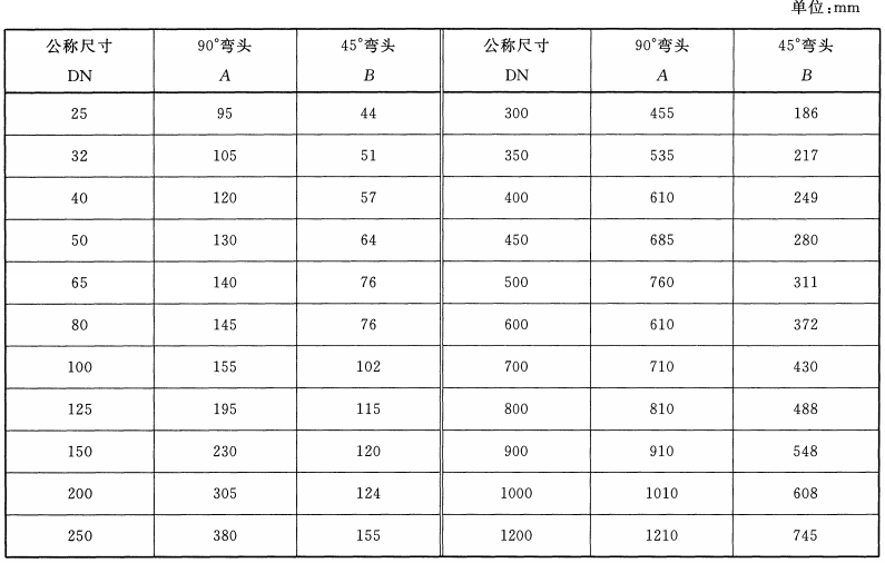 襯塑彎頭管件詳細(xì)尺寸表: