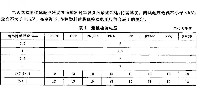 襯塑管100%用電火花檢測(cè)儀進(jìn)行嚴(yán)格檢查。用5~20KV直流電火花檢測(cè)儀檢驗(yàn),初檢電壓15.0KV;24小時(shí)后復(fù)檢,復(fù)檢電壓8.0KV。檢測(cè)時(shí),探頭應(yīng)接觸襯塑層并以100mm/S左右的速度進(jìn)行移動(dòng),移動(dòng)時(shí)若無(wú)電火花出現(xiàn)或未聽(tīng)到報(bào)警聲,則認(rèn)定熱滾塑層針孔檢查合格。